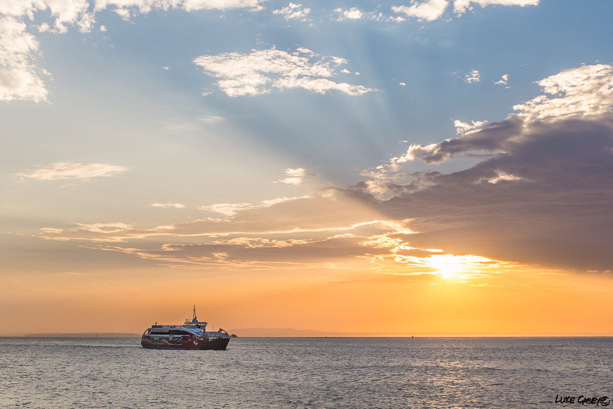 The Setting sun tucked in behind the clouds and created this nice sun rays effect. You seem to see this type of effect often in the summer time ,when the humidity is high. The obstructed low setting sun creates these great lines and patterns in the thick air, with spectacular results. I waiting until the Big Red Cat (ferry) came into frame and built my composition.