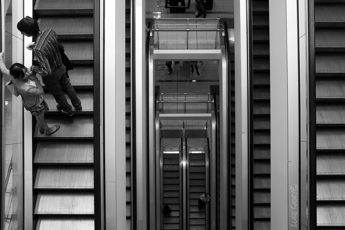 I noticed a section of escalators that caught my eye. Long symmetrical repeating lines. I traveled to the top and found my vantage point. I waited till some customers joined the scene to complete the juxtaposition.